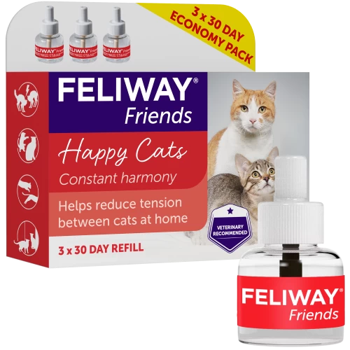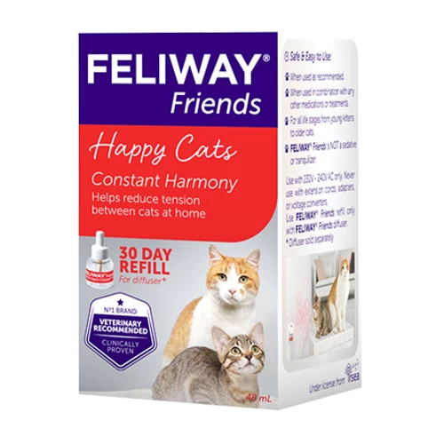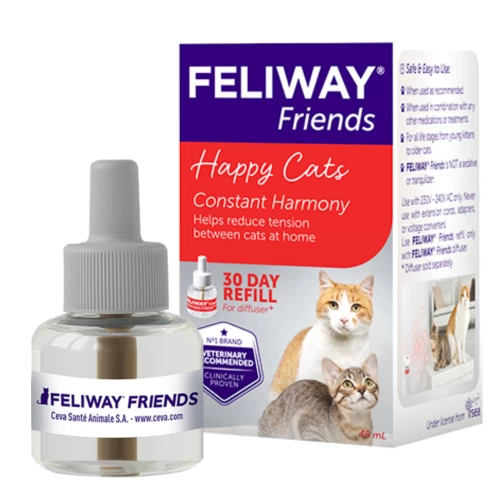 Feliway Friends Cat Calming Diffuser Refill is designed and clinically proven to help minimise and even outright prevent fighting and tension between household cats. If your cats are frequently fighting with each other, hissing, growling, or spitting, or hiding from each other, Feliway Friends may help to reduce these signs of conflict. This refill is to be used exclusively with the Feliway Friends Diffuser unit.