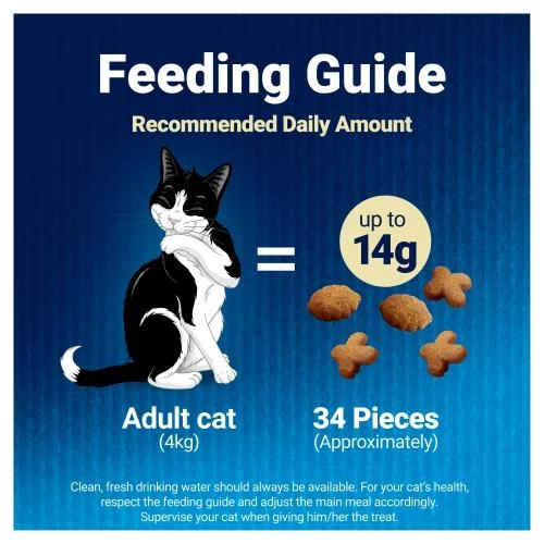 Dally feeding amount up to: Adult 4kg 14g or approx. 35 pieces. Clean, fresh drinking water should always be available. For your cat’s health, respect the feeding guide and adjust your main meal accordingly. Supervise your cat when giving him/her the treat.