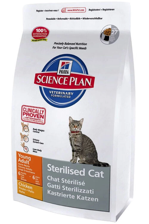 Optimally balanced Hill’s nutrition to keep neutered cats from 6 months to 6 years fit and healthy, day by day, with L-carnitine and L-lysine to maintain ideal weight. Hill’s Science Plan Feline Young Adult Sterilised Cat Chicken is an optimally adjusted cat food for neutered cats from 6 months to 6 years. Many cat owners have their cat neutered to avoid pregnancy and certain undesirable behaviours. On the downside, neutering increases the risk of becoming overweight and developing bladder stones threefold. Overweight can in turn lead to serious health problems such as diabetes mellitus. Reasons for excess weight after neutering: Reduction of sexual hormones slows down the metabolism The cat’s appetite rises by up to 25% Energy use reduces on average by 30% Reasons for the development of bladder stones after neutering: Neutered cats tend to drink less often, resulting in more concentrated urine Concentrated urine may lead to a disadvantageous urine pH Minerals in high concentration in the urine can collect and result in stone development These health risks mean your cat will have special dietary requirements for its whole life. The good news is that a special diet can reduce the risks. This is why Hill’s Science Plan Sterilised Cat Young Adult was developed for daily feeding. It promotes healthy development and keeps your cat fit, from young age well into adulthood. Hill’s Science Plan Feline Young Adult Sterilised Cat Chicken provides the ideal combination of ingredients to support your neutered cat’s health from 6 months to 6 years: Unique Weight Management Formula: Low fat contents enable adjusted feeding amounts Controlled calorie intake for optimal energy provision L-carnitine and L-lysine help – clinically proven – to prevent fat storage and maintain slender muscle mass For healthy kidneys and a healthy urinary tract: Adjusted mineral contents avoid stone development and support healthy kidney functions Effective regulation of the urine pH-value Clinically tested antioxidants with proven effect: High contents of vitamins E and C Maintains a strong immune system Neutralises free radicals Older cats have different dietary requirements from young cats, especially due to their weakening kidney functions. Hill’s Science Plan is the only brand that offers two different compositions of cat food, adjusted to the different requirements of young and older neutered cats. Hill’s Science Plan Sterilised Cat Young Adult supports you in giving the best nutrition to your young neutered cat (6 months to 6 years).