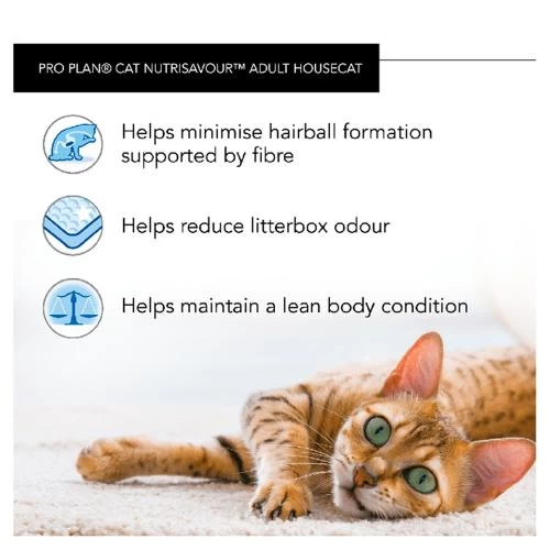 The Purina PRO PLAN NutriSavour for adult cats who live mainly indoors is a complete balanced wet food that helps maintain your cats lean body condition, minimise hairball formation and reduces litterbox odour. Made with high quality nutrition and rich in protein in a delicious gravy that your cat will love.