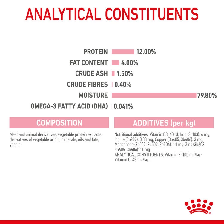 ROYAL CANIN® Kitten In Jelly Wet Food is wonderfully delicious, in a complete and balanced recipe that will offer everything your new addition needs to grow and thrive. Containing a variety of nutrients that will support the development of bones, organs and muscles, as well as vitamins C and E to build a strong immune and nervous system, this tasty meal is enriched with omega 3 fatty acids that will help to develop the brain and vision.