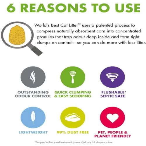 Worlds Best Cat Litter Original Clumping Formula has outstanding odour control and tight clumping ability, World’s Best Cat Litter Original Unscented formula harnesses the power of naturally absorbent corn to deliver 2X longer lasting performance than the leading US litter brand. This naturally safe solution allows cat lovers like you to smell less, clean less and buy less. This formula is ideal for homes with 1 or 2 cats.